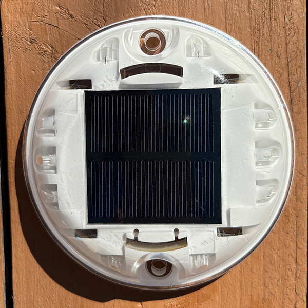 Made of PC material through injection molding, designed with a total of 10 LED lights in 4 directions, symmetrically arranged with 2 LEDs each or 4 LEDs each. Suitable for dashed lines and crosswalks on roads,During the day, solar energy is stored, and at night, it automatically emits light.