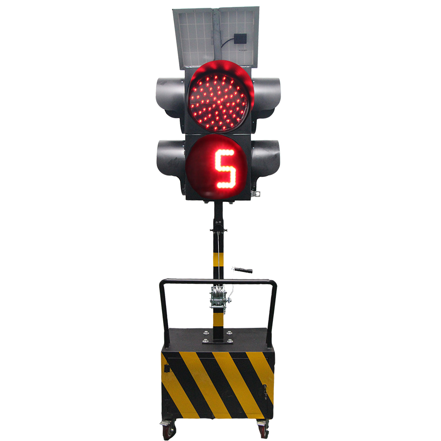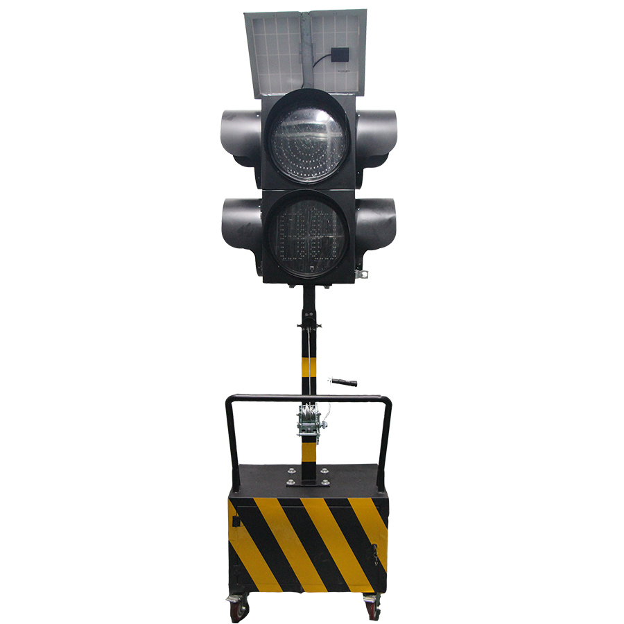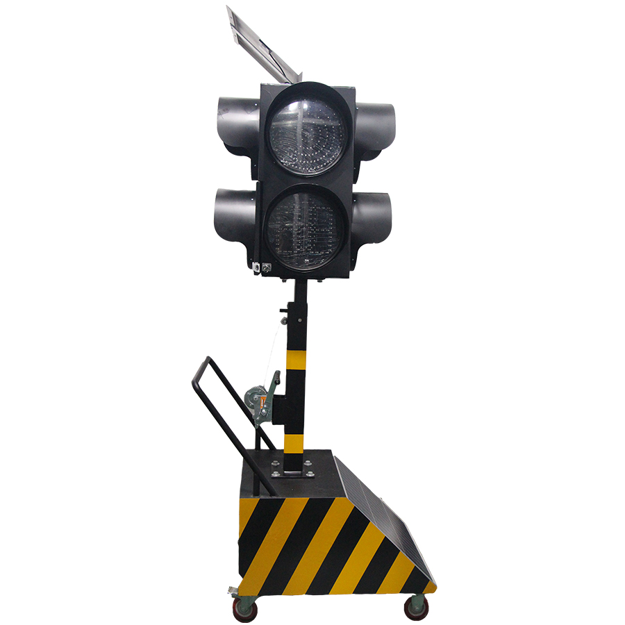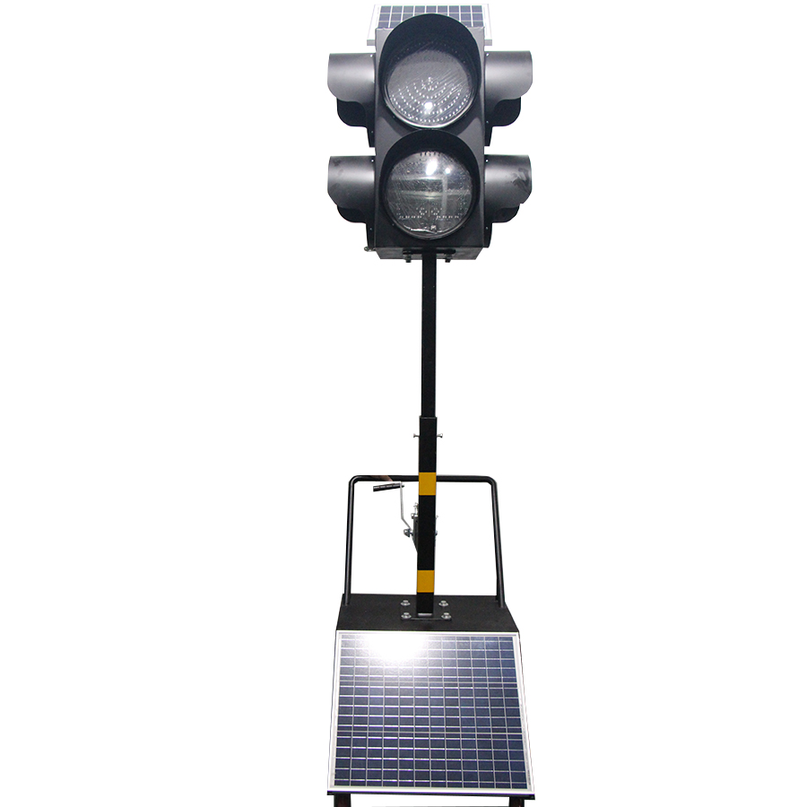 The structure of the solar-powered mobile traffic signal light includes a tire chassis, a base for placing batteries, a manually adjustable support pole, light fixtures for controlling multiple phases in four directions, and a solar panel. The height can be adjusted as needed, usually up to 12 feet, and can be customized and developed according to customer requirements.