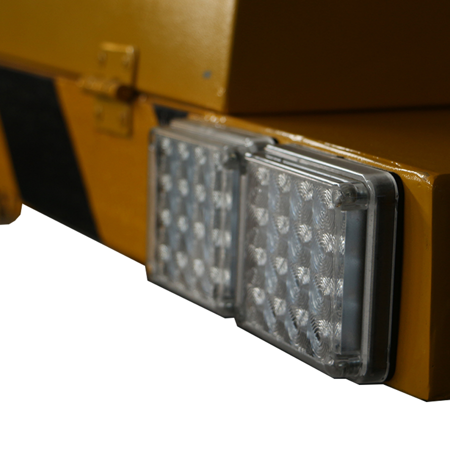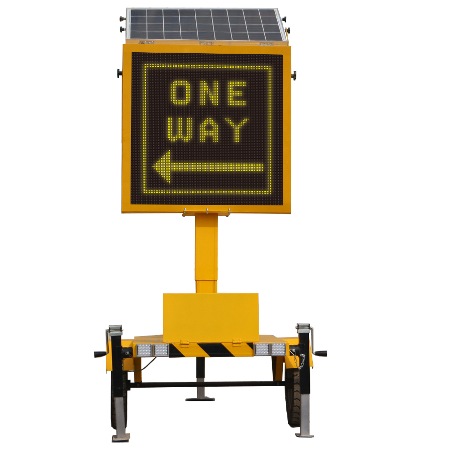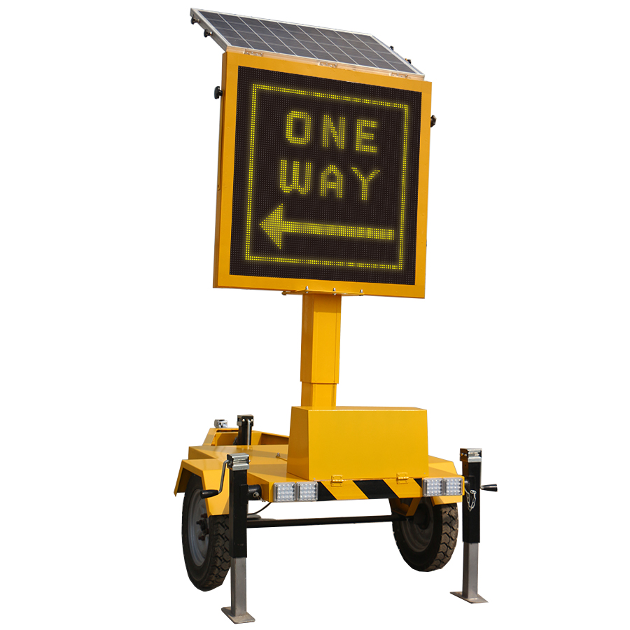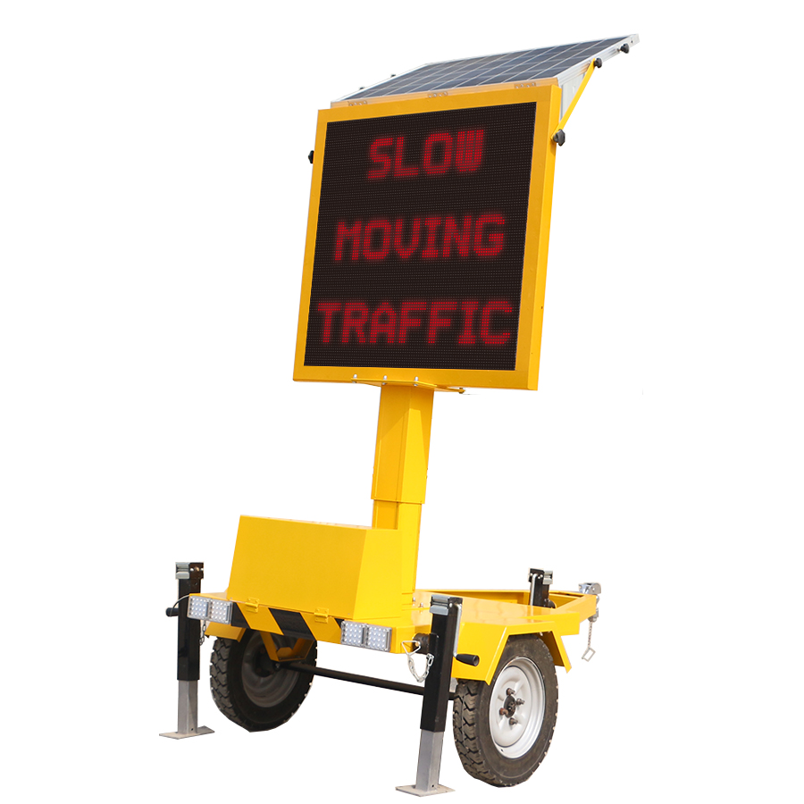 Product introduction: This product is mainly used for variable message displays in road traffic guidance. It is powered by solar energy, with an adjustable height LED display screen. The lifting system has a lift range of 41.5-99 cm (can be stopped midway). The solar panels are flip-capable, allowing for adjustment of the optimal light collection height based on sunlight. The height is adjustable. The frame comes with two adjustable support jacks, providing stability up to wind force level 7, designed for towing speeds of up to 80 km/h.